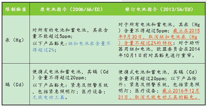 2013年12月10日,歐盟官方公報(bào)(OJ)發(fā)布新指令2013/56/EU,修訂電池指令2006/66/EC。該指令于2015年7月1日生效。新舊指令針對(duì)限制物質(zhì)汞和鎘的使用做了修改,如下圖所示。對(duì)于不符合該指令要求、且在相關(guān)限制生效前已進(jìn)入市場(chǎng)的電池和蓄電池,仍可繼續(xù)銷(xiāo)售直至庫(kù)存售完為止。