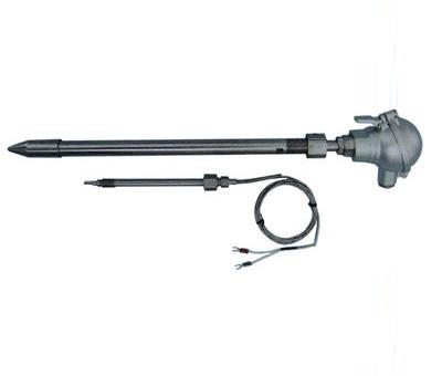 密煉機用耐磨熱電偶尖端部分采用航空工業用超高強度合金制造,其屈服強度,抗拉強度高,在密煉室內超高壓力下不變形,特殊專利設計其靈敏度不低于同類進口產品,耐磨部分采用加厚處理,連續工作不低于4000小時,在實際使用中有多次超過9000小時的記錄,仿進口接線盒雙螺栓固定,避免盒蓋脫落進入膠料中,引發品質事故.高溫耐磨頭系本公司自主開發的耐磨合金整體盲孔加工,其在電廠循環流化床鍋爐,沸騰爐及水泥廠旋轉窯窯尾等有高溫顆粒強烈沖刷的場合表現出色.長時間高溫(正常運行溫度>1000度),強腐蝕(高硫氣氛),高速固體顆粒沖刷(8mm直徑,速度>5m/s)情況下,使用壽命超過1年. 分度號K.S.J.
