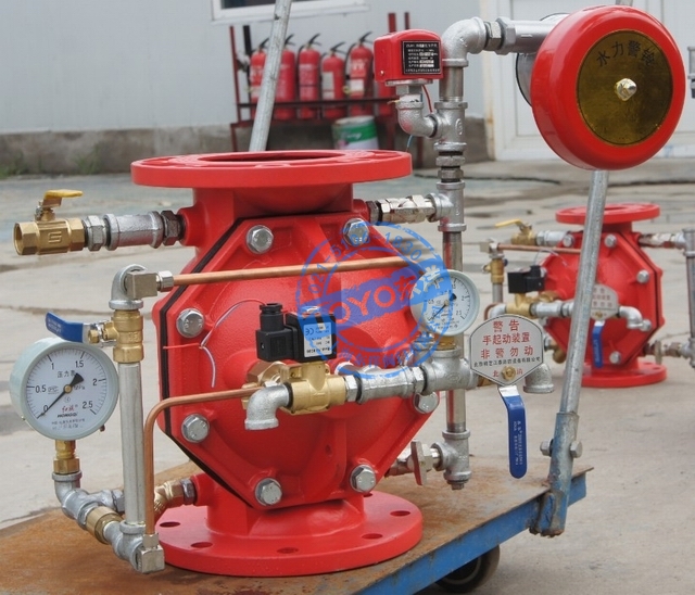 隔膜室(控制腔)內的壓力,由裝在保護區內的探測系統來控制,這個探測系統同時也就是雨淋閥隔膜的驅動系統,此系統分為電動控制,氣動控制或液壓控制。