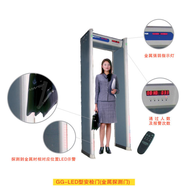 聲光報警,音調快慢可區分金屬物大小,多種報警音量模式適用于不同場合的選擇,通過門柱左右超亮LED報警燈可準確顯示人體相應高度藏匿的違禁物品。