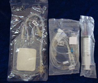 將所有的夾子關閉,帶排氣孔的插瓶器連接生理鹽水袋(瓶),采血端口連接延長管,,并將延長管插入血袋短的一端