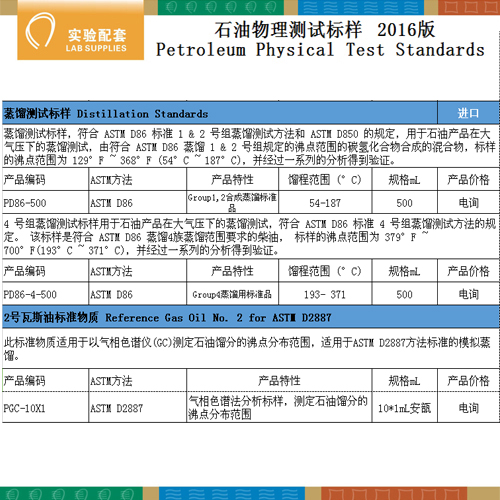 我公司核心推薦產品:GB/T261-2008閃點標準樣品、GB/T3536-2008開口閃點標準油、開口閃點參比油,SH/T0248-2006冷濾點標準油、冷濾點測定儀器校準物質、冷濾點標準物質、粘度標準油、黏度標準液、石油物性校準物質、餾程標準品、卡爾費休水分標準品、烴含量標準品、凝點標準品、923級硅膠、進口試劑、對萘酚苯甲醇、對萘酚苯指示劑、水質總硬度測試膠囊等石油化工標準樣品及參比樣品。