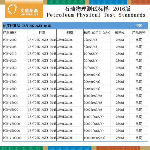 國標粘度標準油(20℃)有2(mm2/s)、5(mm2/s)、10(mm2/s)、20(mm2/s)、50(mm2/s)、100(mm2/s)、200(mm2/s)、500(mm2/s)、1000(mm2/s)、2000(mm2/s)、5000(mm2/s)、10000(mm2/s)、20000(mm2/s)、50000(mm2/s)、100000(mm2/s)。