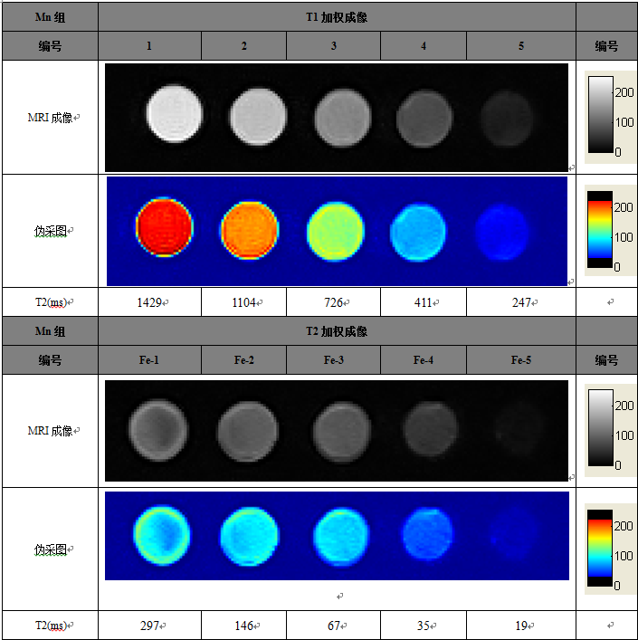 這批造影劑樣品的T2加權(quán)像可見上表,從圖中可以看出亮度明暗對(duì)比非常明顯。 而T2加權(quán)像剛好相反,抑制了短弛豫的信號(hào),突出長弛豫的信號(hào),即弛豫時(shí)間越長,在圖像中越亮(偽采圖中顯示越紅),所以從1至5號(hào)亮度依次變暗。