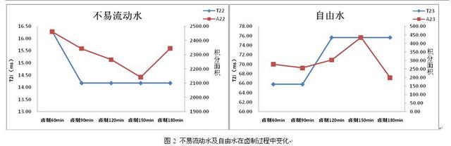牛肉中蛋白質的弛豫時間較短,在儀器的死時間之內(nèi),NMR檢測到的有效信號來自于牛肉中的水分及脂肪。可推斷T21表示與蛋白質大分子基團結合緊密的結合水層,對應的峰面積比例A21;T22表示存在于肌原纖維內(nèi)部的不易流動水層,對應的峰面積A22;T23表示介于細胞膜之間能自由流動的自由水層,對應的峰面積A23。