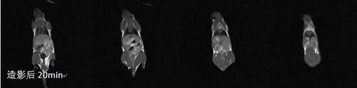 結論:直接觀察小鼠冠狀面圖像,可以清晰觀察老鼠體內的各個組織器官。通過對老鼠尾靜脈注射T1造影劑,能觀察到3號/4號造影劑在各組織的造影效果。1/2號造影劑由于濃度高、毒性高,尾靜脈注射老鼠體內后,老鼠均抽搐死亡。MRI能較清晰的看到小鼠的器官組織及納米粒子的擴散情況,對于評價該種造影劑的作用效果、作用部位、作用效果有非常直觀的幫助。