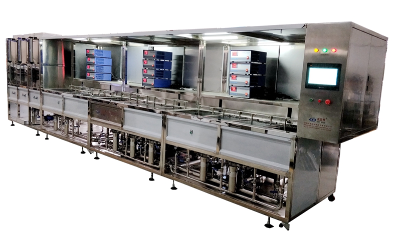 威固特VGT-1509FH超聲波清洗機,共有15個功能槽,配置有拋動系統、循環過濾系統、自動恒溫系統、超聲波清洗系統、定時系統、框架系統、C02滅火系統等。設備采用環保型水溶劑洗滌、純水漂洗,為環保型清洗系統。
