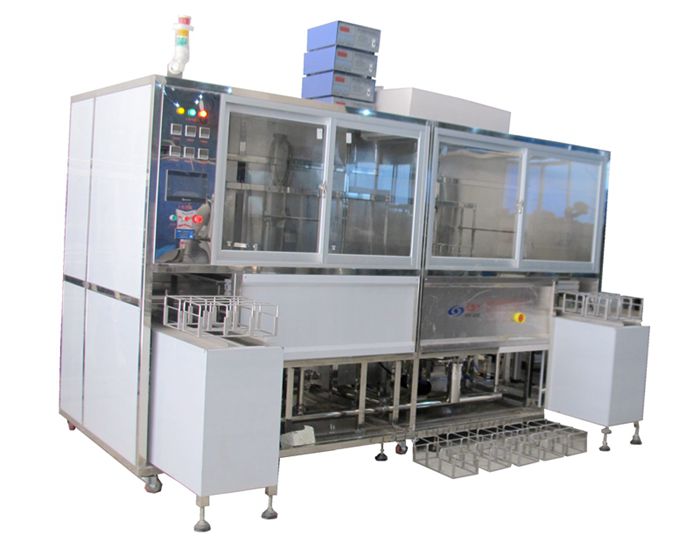 自動(dòng)上料→1槽清洗劑超聲清洗28K→2槽清洗劑超聲清洗40K→3槽純水超聲漂洗28K→4槽純水超聲漂洗40K→5槽純水超聲漂洗40K→6槽熱風(fēng)烘干→自動(dòng)下料。