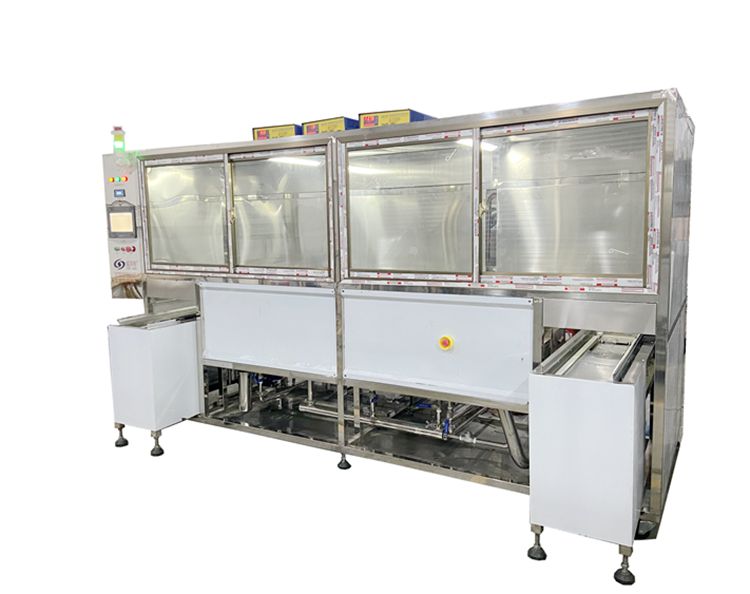 威固特VGT-507FTA為一臺(tái)非標(biāo)自動(dòng)智能式超聲波清洗機(jī)。本設(shè)備的清洗工藝流程是:自動(dòng)上料—1超聲浸泡酸洗—2噴淋清洗—3超聲純水漂洗(拋動(dòng))—4超聲純水漂洗(拋動(dòng))—5熱風(fēng)烘干—自動(dòng)下料。