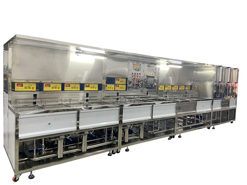 VGT-1507FS為光學玻璃超聲波清洗機,設備共有15個功能槽,配置有循環過濾系統、自動恒溫系統、拋動系統、超聲波清洗系統、抽風裝置、溢流系統等。其中清洗部分與離心干燥部分分別獨立電器控制柜,設備采用環保型水溶劑洗滌、純水漂洗、離心甩干(甩干機),為環保型清洗機。