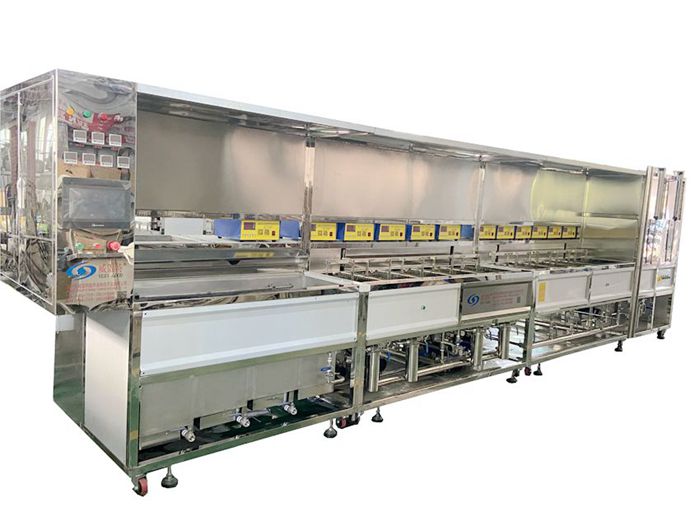 上料→蒸餾回收系統(tǒng)→1環(huán)保液→2環(huán)保液→3環(huán)保液→4環(huán)保液→5洗劑清洗→6洗劑清洗→7市水漂洗→8洗劑清洗→9市水清洗→10純水漂洗→11純水漂洗→12純水漂洗→13IPA漂洗→14IPA漂洗→15IPA漂洗→16IPA漂洗→17IPA烘干→下料。