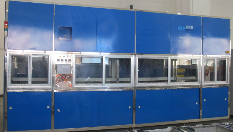 - 全自動超聲波清洗機原理主要是將換能器,將功率超聲頻源的聲能,并且要轉換成機械振動,通過清洗槽壁使之將槽子中的清洗液輻射到超聲波。由于受到輻射的超聲波,使之槽內液體中的微氣泡能夠在聲波的作用下從而保持振動。 當聲壓或者聲強受到壓力到達一定程度時候,氣泡就會迅速膨脹,然后又突然閉合。在這段過程中,氣泡閉合的瞬間產生沖擊波,使氣泡周圍產生1012-1013pa的壓力及局調溫,這種超聲波空化所產生的巨大壓力能破壞不溶性污物而使他們分化于溶液中,蒸汽型空化對污垢的直接反復沖擊。 一方面破壞污物與清洗件表面的吸附,另一方面能引起污物層的疲勞破壞而被駁離,氣體型氣泡的振動對固體表面進行擦洗,污層一旦有縫可鉆,氣泡立即“鉆入”振動使污層脫落,由于空化作用,兩種液體在界面迅速分散而乳化,當固體粒子被油污裹著而粘附在清洗件表面時,油被乳化、固體粒子自行脫落,超聲在清洗液中傳播時會產生正負交變的聲壓,形成射流,沖擊清洗件,同時由于非線性效應會產生聲流和微聲流,而超聲空化在固體和液體界面會產生高速的微射流,所有這些作用,能夠破壞污物,除去或削弱邊界污層,增加攪拌、擴散作用,加速可溶性污物的溶解,強化化學清洗劑的清洗作用。由此可見,凡是液體能浸到且聲場存在的地方都有清洗作用,其特點適用于表面形狀非常復雜的零件的清洗。尤其是采用這一技術后,可減少化學溶劑的用量,從而大大降低環境污染。