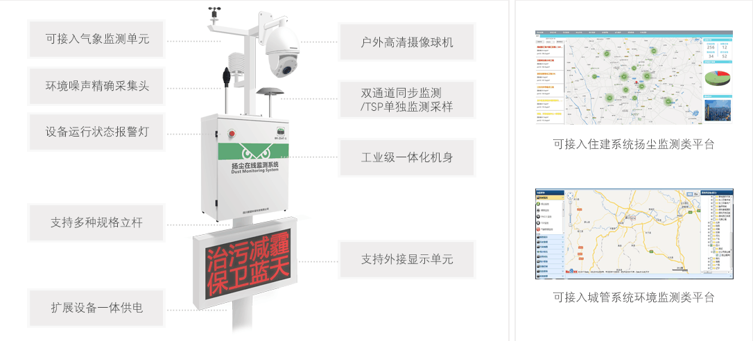 BR-ZS4T-S揚塵在線監測系統是四川瞭望自主研發的的全天候戶外揚塵噪聲自動監測終端儀器。此監測儀器符合行業相關標準及環境保護法,可無縫對接數字城管、智慧城市、數字工地、智慧環保、物聯網等大型系統平臺,是建筑工地、城市交通環境和工廠礦企業監督評價首選設備,為國內領先的戶外揚塵噪聲監測終端
