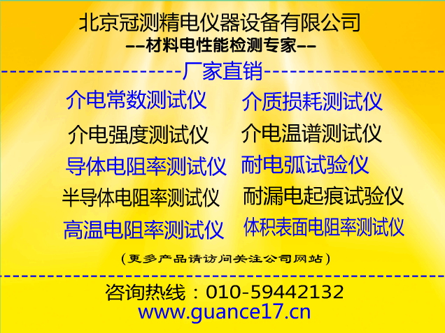 ◆★◆北京冠測精電儀器設備有限公司是全國最知名的材料電性能檢測專家,公司主營體積表面電阻率測試儀,耐漏電起痕試驗儀,介電溫譜測試儀,介電強度測試儀,導體電阻率測試儀,耐電弧試驗儀,半導體電阻率測試儀,高溫電阻率測試儀,介質損耗測試儀,介電常數測試儀。熱線電話010-57223838,聯系手機13611301300。公司主頁www.guance17.cn◆★◆液體介電常數測試儀,介電常數與介電強度測試儀,精密介質損耗測量儀,介質損耗儀,液體介電常數測定儀,電容及介質損耗測試儀,塑料介電常數測試儀,介質損耗試驗儀,介電常數的測定,介電常數如何測量,橡膠介電常數測定儀