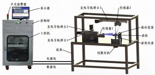 設備對基體進行測量時,基體旋轉一周取出測量距離的兩個值相加即得到基體的一條直徑線尺寸。測量完成后,旋轉托盤根據測量值出現的位置將測得的直徑線旋轉至與測量光束重合的位置。然后推桿裝置動作,使基體向垂直于測量光束的方向偏移。然后旋轉托盤帶動基體旋轉測量第二條直徑線,并停止在第二條直徑線與測量光束重合的位置。采用同樣的方法測量第三、第四等直徑尺寸。當基體中心與旋轉托盤測量中心的偏心量基本相同時,基體的圓心在旋轉托盤上呈漸開線分布,測量第七次時測量的直徑與第一條直徑基本重合,所以測量6次即可。通過6個直徑尺寸可計算出基體的直徑、橢圓度、平均直徑等特征參數。
