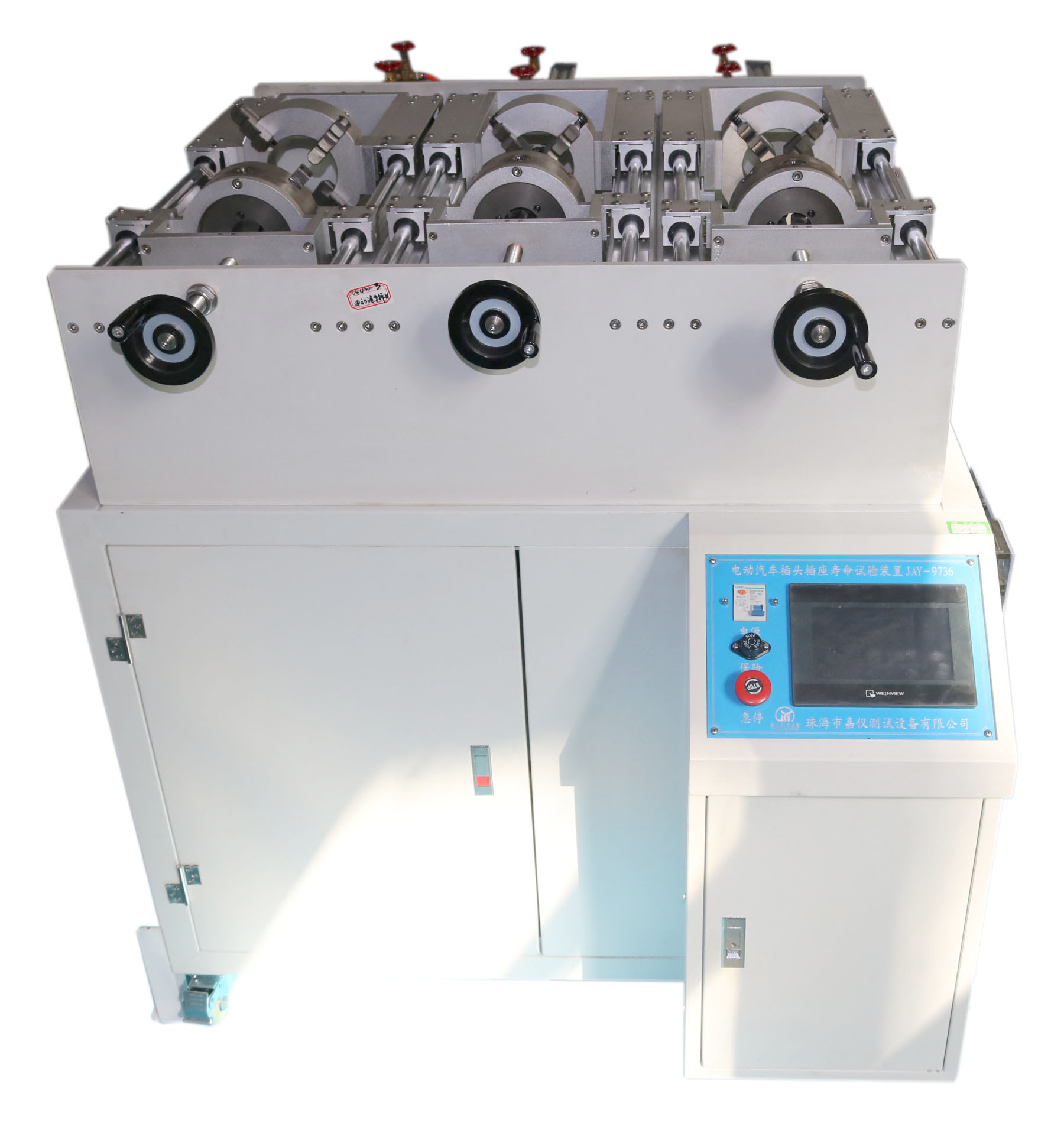 本試驗裝置根據GB/T 20234.1-2015 設計制造,適用于各類電動汽車插頭插座壽命試驗,符合6.11分斷能力、6.12使用壽命、6.20限制短路電流耐受試驗條款要求,測試插頭插座有無外殼或隔板劣化、插銷絕緣帽有無松脫、有無引起著火等。設備結構分插頭插座壽命試驗機、電源負載箱,其中插頭插座壽命試驗機采用高檔鋁型材框架、鋁合金板、定制夾具機構、滑塊導軌、步進電機加絲桿。定制夾具下圖可見,特點為四面夾持可調中心,夾持工件牢固不易松脫且兩邊帶導軌,保證每次動作都在同一位置。觸摸屏操作面板組合,使用方便;電源負載箱落地式鈑金箱,進行電流、電壓、功率因素調節,實現空載帶電(額定電壓,無電流)插拔循環試驗和不分斷的短路方式循環試驗。