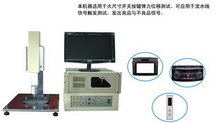 - S205BK快速荷重位移曲線儀適用于大尺寸開關(guān)按鍵彈力位移測(cè)試,可應(yīng)用于流水線信號(hào)觸發(fā)測(cè)試,發(fā)出良品與不良品信號(hào),以達(dá)到快速檢出OK與NG產(chǎn)品目的。此款試驗(yàn)機(jī)測(cè)試頭下面空間大,更適合裝配了按鍵開關(guān)的成品或半成品的測(cè)試。可以測(cè)試鍋?zhàn)衅椘⒐柘鹉z按鍵、微動(dòng)開關(guān)、薄膜開關(guān)、按鍵、鍵盤、多媒體面板按鍵、電器面板按鍵,遙控器按鍵等各種按鍵開關(guān)測(cè)試。