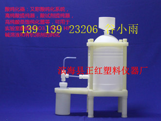 濱海正紅---酸純化器:又稱酸純化系統,高純酸提純器,酸試劑提純器,高純酸蒸餾純化器等,可用于實驗室酸如HNO3、HCl、HF、堿溶液和有機溶劑的純化,純化后的酸和Merck的一樣好,可用于痕量和超痕量分析的樣品制備,純化器帶有液位計方便觀察里面的溶液,一個出酸口,一個排廢液口,操作維護方便,是超純凈實驗室化學反應的必備產品。 --(谷小雨 139 139 23206 ; 025-8322 4668 )實驗后期可配套我單位Teflon特氟龍系列試劑瓶收取高純酸。為了滿足更多客戶的需求,我廠研發了更大規格的酸純化器(2000ml)
