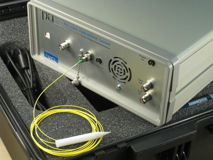 FOHS光纖水聽器,英國PA FOHS光纖水聽器不受電磁干擾的影響,因此非常適合在1.0 MHz至40 MHz頻率范圍內的廣泛應用,尤其是治療性超聲波。它還可以測量溫度變化,從而使用戶能夠同時測量壓力波形和由它們在周圍介質中的吸收引起的超聲感應加熱。