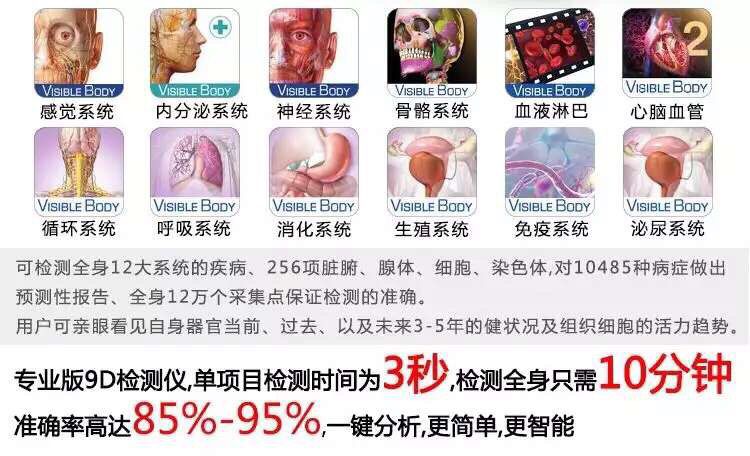 “HRA健康風險評估系統”對人體10大系統近300個器官,進行快速、安全、準確的檢測。人體從“健康”到“疾病”的不同階段中,身體各器官的狀況參數以量化數值方式顯示,為醫生診斷提供科學依據。圖像化的3D掃描結果更直觀。前瞻性的健康風險預警,海量數據庫的多維交叉對比,可預測未來3-5年的健康趨勢。