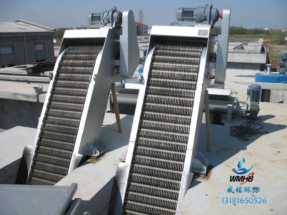 耙齒鏈運轉到設備的上部時,由于槽輪和彎軌的導向,使每組耙齒之間產生相對自清運動,絕大部分固體物質靠重力落下。另一部分則依靠清掃器的反向運動把粘在耙齒上的雜物清掃干凈。