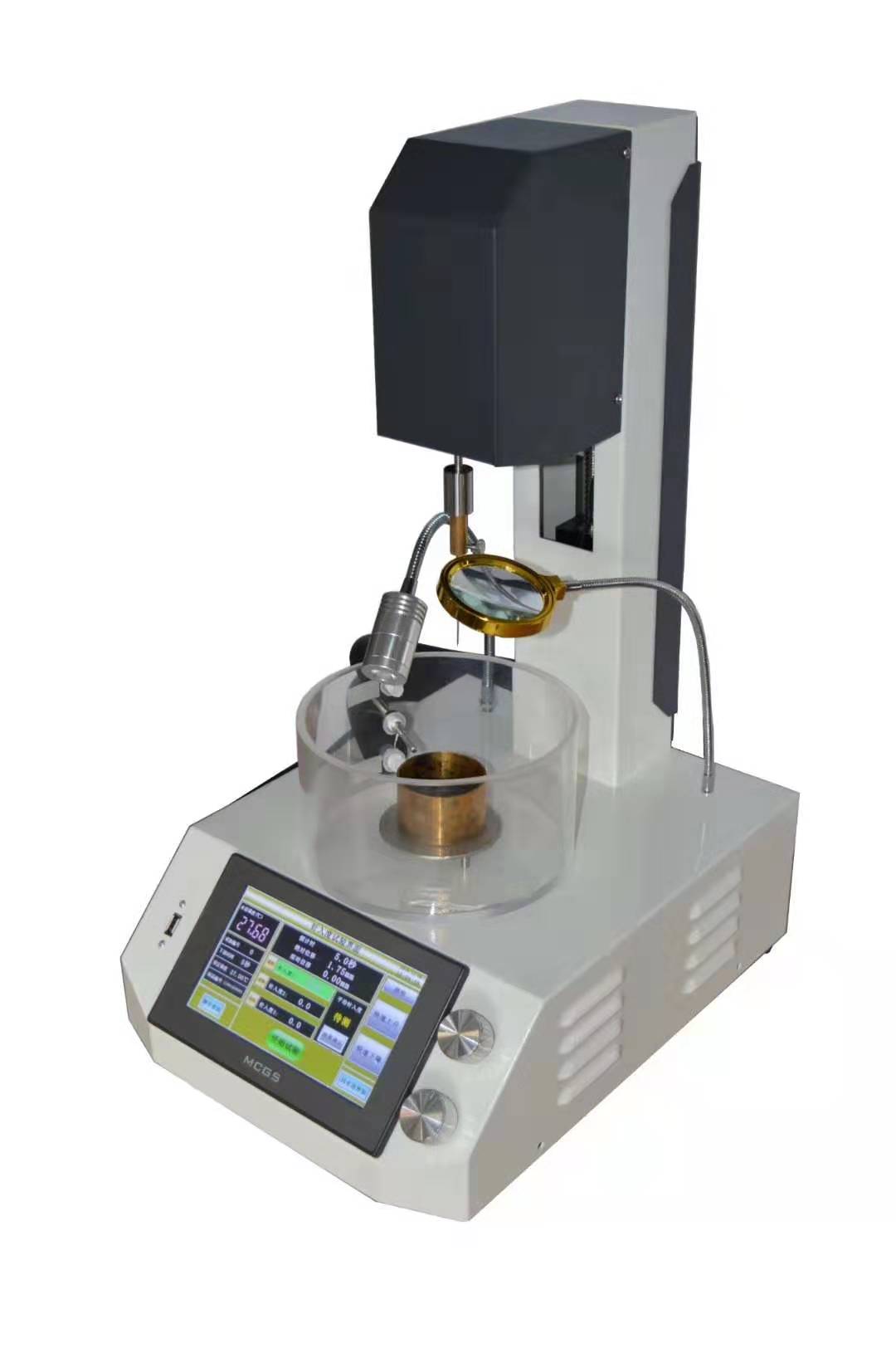 1、儀器主要由機(jī)箱支架、觸摸顯示器、絲杠升降系統(tǒng)、恒溫控制系統(tǒng)、錐連桿組件、位移測(cè)量系統(tǒng)等部分組成。