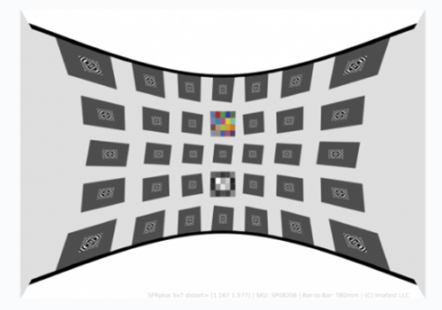 - SFRplus 汽車影像測試卡采用了預畸變的形式,適合超廣角鏡頭的汽車影像或魚眼鏡頭等極大畸變的攝像頭的成像系統。