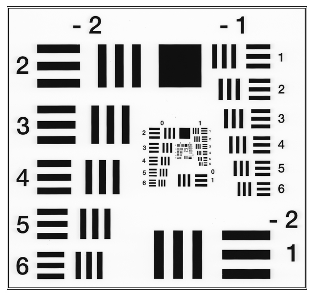 測試卡是在35mm膠片上包含0至7組的透射式高對比度分辨率條。 組中的單個圖案基于白色背景上的3個黑色條。 這些圖案存在于水平和垂直方向。 該結構對應于USAF 1951標準。