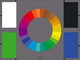 色鍵測試卡TE229用于檢查相機的顏色。 測試卡上由一個30種不同顏色的圓圈和四個顏色為白色,灰色,綠色和藍色的補丁組成。