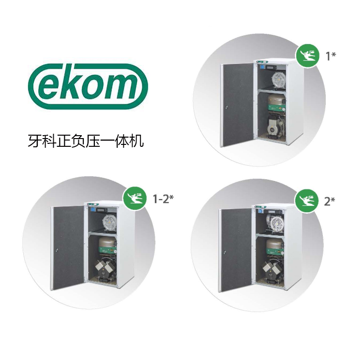 EKOM專門為小型牙科診所研制了牙科正負壓一體機,牙科干式抽吸泵和牙科空壓機的完美結合,無需安裝機房,自帶靜音箱,噪音低至47db,可直接安裝于牙科診室內。