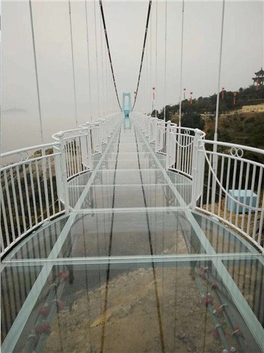 目前,在我國各個省市縣區(qū)都有玻璃吊橋的身影。城市人游走在冰冷的水泥森林中,難以享受大自然,景觀棧道吊橋為人們提供了親近自然的好途徑。也給市民帶來了巨大的生態(tài)福利。并且玻璃吊橋的設計安裝是要達到一定效果的。 玻璃吊橋主要采用的是特種水晶夾膠玻璃組合而成的,因而是集實用性、安全性與美觀于一體的。因此吊橋的施工安裝常見的材質(zhì)無外乎防腐木及特種鋼化玻璃了,要知道這種采用特種玻璃組合而成的玻璃景觀可是聚集了實用性與美觀度的一面。