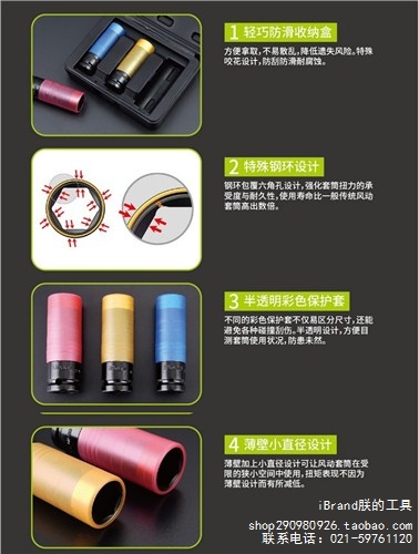 2) 高壽命風動長套筒使用不同的半透明彩色塑料套環來區別尺寸,以便使用者在工作場合中能快速辨識所需尺寸。半透明彩色塑料套環包覆在套筒堅硬表面外,能避免各種碰撞刮傷,如刮傷輪框上的烤漆等。半透明設計,方便目測套筒使用狀況。