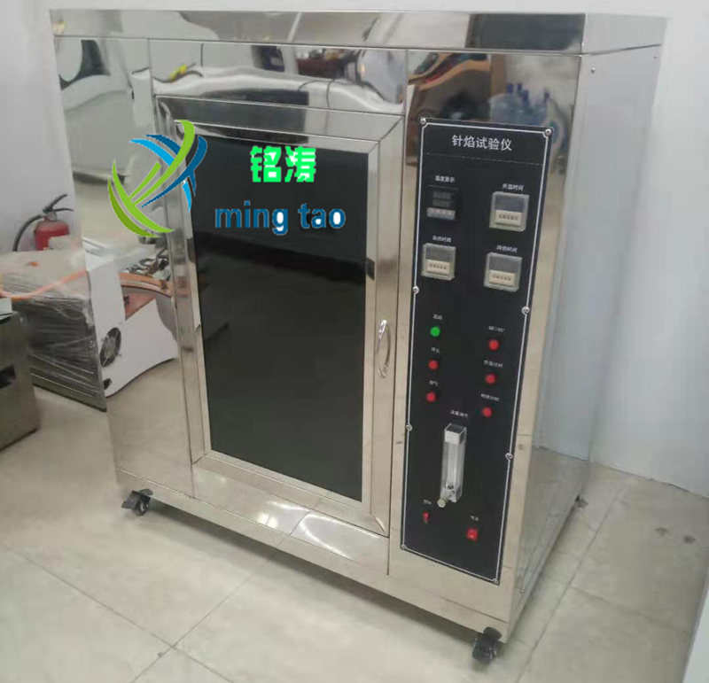 針焰試驗(yàn)儀是用規(guī)定尺寸(Φ0.9mm )的針狀燃燒器,通以特定燃?xì)?丁烷),以 45°角定時(shí)定向施燃試品,視試品是否引燃及持燃時(shí)間和燃燒長(zhǎng)度來(lái)評(píng)定設(shè)備內(nèi)部因故障條件造成的小火焰的著火危險(xiǎn)性。