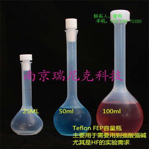 3.Teflon FEP容量瓶是一個透明的長頸瓶,瓶體為梨形,便于搖蕩液體和洗刷,可替代市場上昂貴的PFA容量瓶;
