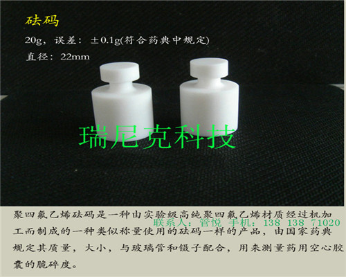 聚四氟乙烯砝碼是一種由實(shí)驗(yàn)級(jí)高純聚四氟乙烯材質(zhì)經(jīng)過(guò)機(jī)加工而制成的一種類似稱量使用的砝碼一樣的產(chǎn)品,由國(guó)家藥典規(guī)定其質(zhì)量,大小,與木板、玻璃管和鑷子配合,用來(lái)測(cè)量藥用空心膠囊的脆碎度。