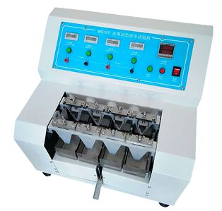 - 產品說明:皮革、人造皮、布料…等,在外圍有水之下,施以撓折動作,以測知材料耐滲透指數。測試方式采用潔凈的鋼珠置于材料內裹,鋼珠本身之阻抗以及總和重量,都必須符合規定,在此條件下值測材料曲折防水滲透指數,采用最新感應元件及特殊設計,測試中只要材料內裹被水滲透立即自動停止計數或在設定時間(測試次數)到達時,即自動停機并顯示時間或次數。