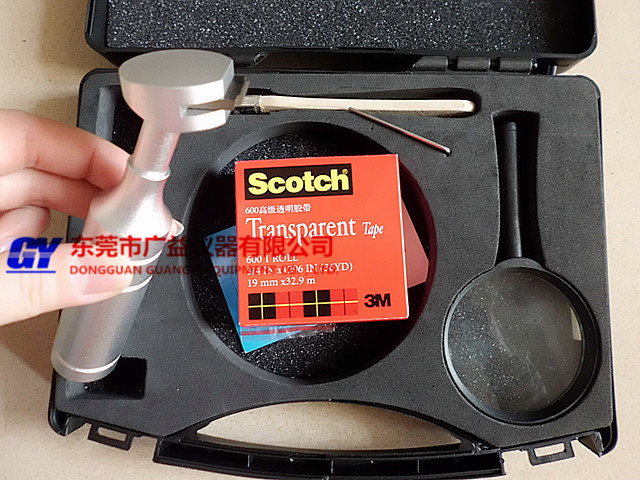 3、測(cè)試膠帶必須是美國(guó)3M公司生產(chǎn)的600-1PK測(cè)試專(zhuān)用膠帶。將膠帶貼在整個(gè)劃格上,然后以最小角度撕下,結(jié)果可根據(jù)漆膜表面被膠落面積的比例來(lái)求得。