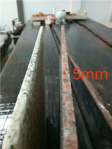 我們采用對刨工藝加工出超薄石材,原料(兩面拋光面或火燒面)從板材厚度中間對刨一分為二,鋸片切割鋸路(鋸路:鋸片切割磨損石材部分)為8㎜。如果需要6㎜厚的超薄石材成品板,計算方式是6+6+8=20㎜,需要原料的標準厚度為20㎜。通常傳統石材廠切割厚度標準都不準確,均有誤差,厚度要求時,要不低于**㎜厚的,一般我們要25㎜的,他們提供給的都是22-25㎜厚度的,30㎜的就是27-31㎜的,所以可以比我們厚度計算要求厚1-3㎜沒關系,我們可以根據要求再做控厚處理。最終成品厚度標準,產品厚度標準為±0.5㎜內。