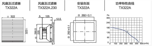 TX322A.230,過濾器可選7032/7035顏色,此款所配風(fēng)機(jī)為TXA80S-225B2H,風(fēng)量550m3/h,電壓230V,頻率50Hz,電流0.30A,功率68W,噪音58dB-A,對應(yīng)曲線圖1;