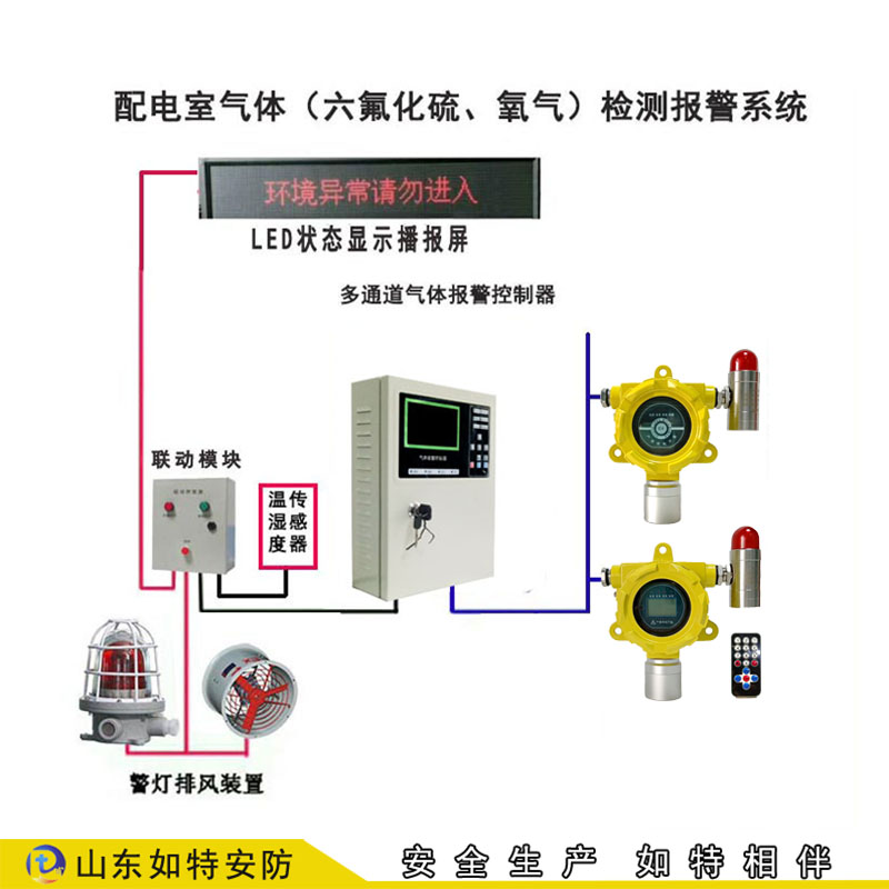 赤峰配電室SF6氣體檢測報警器,工業固定式,壁掛式安裝,通過氣體探測器(探頭)和氣體報警控制(主機)對六氟化硫氣體濃度連續在線監測,并及時聲光報警提醒。值班室安裝的SF6氣體泄漏報警主機可集中監管多個點的探測器,實時接收濃度信號。并根據報警器設置的報警濃度值發出聲光報警信號。本套報警器還可以上傳PLC、DCS、消防系統,以及自動聯動排風扇等設備。
