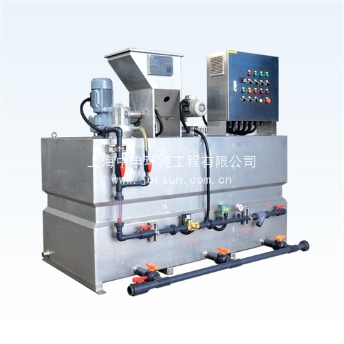 該裝置適用于高分子有機絮凝劑(PAM)的制備與投加,用戶只需將藥劑干粉直接加入設備的料斗中,即可實現全自動的投料、溶解、熟化、儲存、計量假藥等過程,整個過程無需人為操作,完全自動運行。料斗中的粉狀藥劑經定量給料裝置送入混合器中,與水進行完全混合后進入溶液箱中,混合液經多級攪拌后形成均一濃度的溶液,然后進入貯水箱內,根據工藝需求用定量式泵浦進行投加。