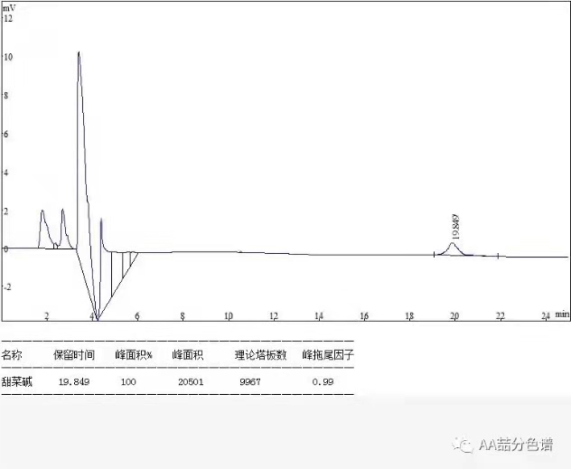 按照高效液相色譜法(通則0512)測定:色譜條件與系統適用性實驗,以氨基鍵合硅膠為填充劑;以乙腈-水(85:15)為流動相檢測波長為195nm,理論板數按甜菜堿峰計算應不低3000。