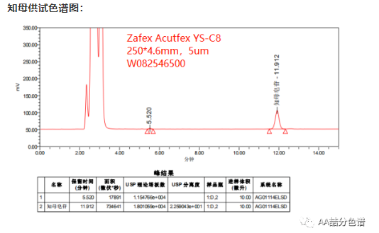 - 芒果苷和知母皂苷BII是中藥知母的主要成分,雖然化合物相對簡單,但是在中國藥典(2015版,2020版)液相檢測的操作中,出峰的峰型不是很好,且理論塔板數較低,好多個品牌的色譜柱均不能妥善解決該問題, 喆分色譜經過不斷的努力嘗試,調整色譜填料鍵和工藝以及微調方法的基礎上解決了知母含量檢測中的常見問題。