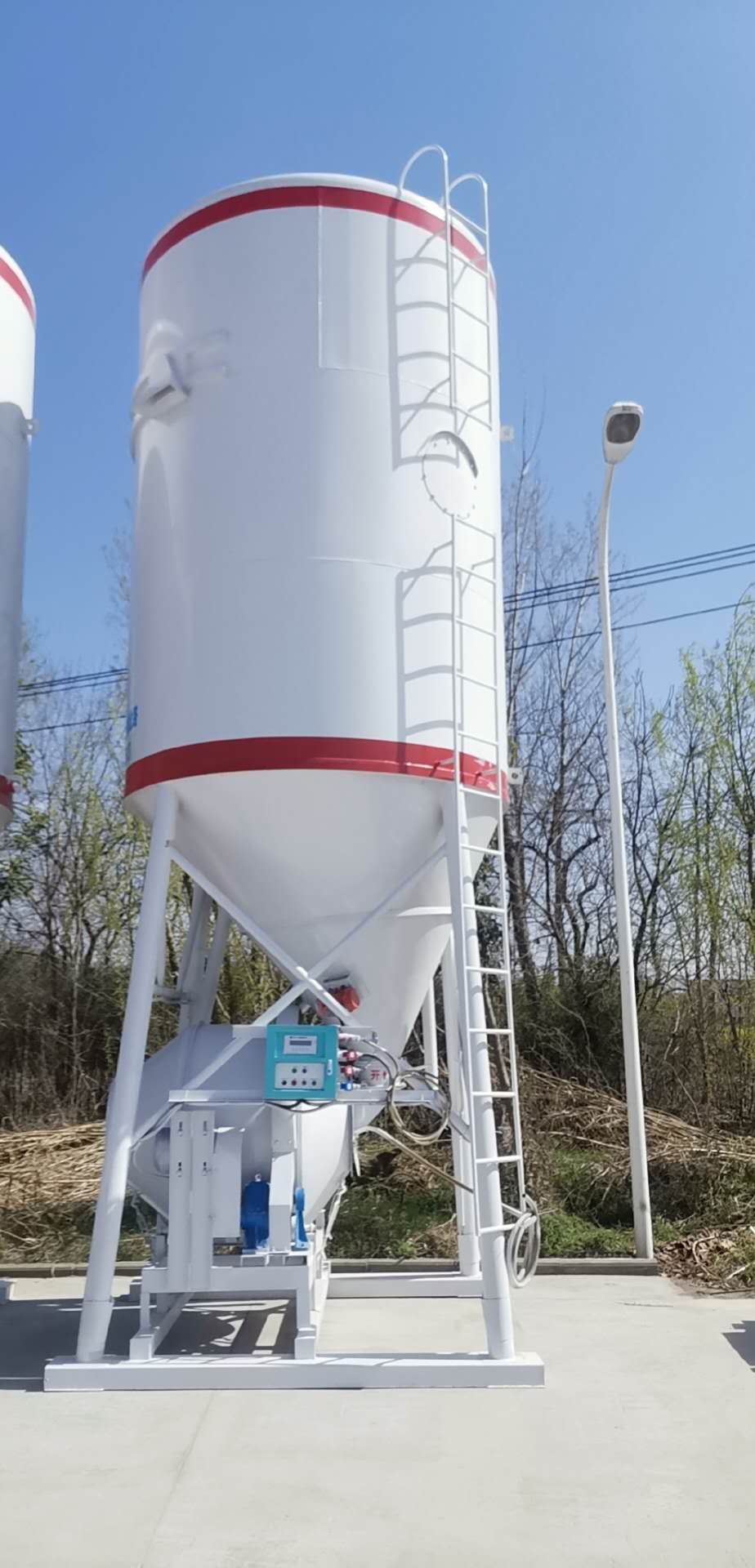 儲(chǔ)料罐作為一個(gè)干粉砂漿的載體存放在施工工地,散裝干粉砂漿通過(guò)砂漿運(yùn)輸車(chē)運(yùn)輸?shù)焦さ?經(jīng)過(guò)氣力將干粉砂漿輸送到儲(chǔ)料罐中,使用時(shí)通過(guò)下端掛接的連續(xù)式攪拌機(jī)進(jìn)行攪拌即可。