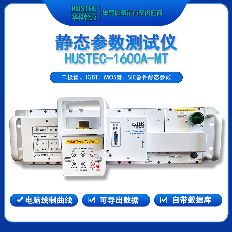 - 華科智源HUSTEC-1600A-MT靜態參數測試儀可用于多種封裝形式的 IGBT測試,還可以測量大功率二極管 、IGBT模塊,大功率 IGBT、大功率雙極型晶體管,MOS管等器件的 V-I 特性測試,測試1200A(可擴展至2000A),5000V以下的各種功率器件,廣泛應用于軌道交通,電動汽車 ,風力發電,變頻器,焊機行業的IGBT來料選型和失效分析,設備還可以用于變頻器,風電,軌道交通,電焊機等行業的在線檢修,無需從電路板上取下來進行單獨測試,可實現在線IGBT檢測,測試方便,測試過程簡單,既可以在測試主機里設置參數直接測試,又可以通過軟件控制主機編程后進行自動測試,通過電腦操作完成 IGBT 的靜態參數測試;