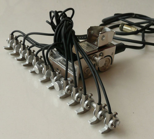 6-126-12型掃描裝置是12通道接觸式大面接觸式檢測裝置。12個單分量磁探測傳感器,全部測量磁場的法向分量,用在對管道、容器、平板等工件應力集中區的大面積快速掃查。掃描裝置設計成小車形狀,12個傳感器按水平布置,傳感器間距、高低、方向可根據被檢測物體狀況調節,有鎖緊結構。鋁制支撐桿,可根據管道、容器的弧度自制不同弧度的支撐桿安裝傳感器以適應不同形狀的被測物體。電纜長度1.5米。集成有4個輪子的計數器,用以記錄檢測長度。
