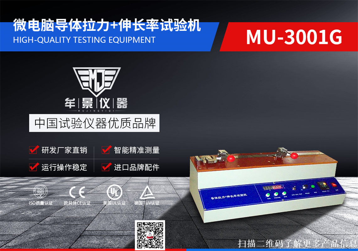 MU3001G微電腦導體拉力+伸長率試驗機適合銅絲、鋁絲、鋁鎂合金絲、鐵絲等金屬絲之伸長率(延伸率)試驗。電路采用運算集成電路及過程控制,無需人工計算,自動顯示伸長率的百分比;伸長長度采用激光感測技術,感測精度高,全量程范圍誤差為±0.3百分比。符合:UL、CSA、GB、ASTM、VDE、IEC試驗標準。導體拉力+伸長率試驗機是在原基礎上增加了可以同時測試拉力之功能,操作更實用、更簡便。