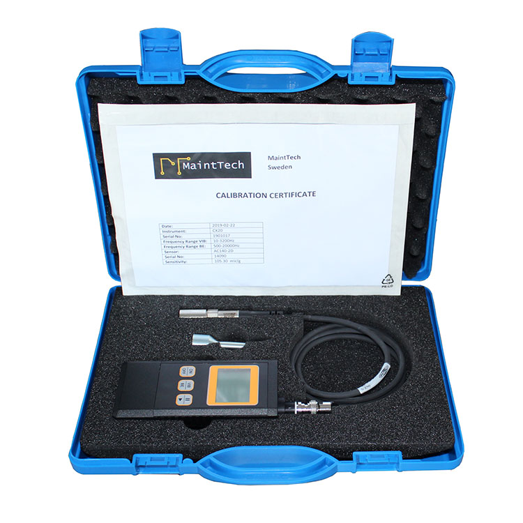 CX20測振儀采用ISO標準所使用的單位-mm/sRMS,作為總振動值的量測單位,RMS值在振動訊號上所代表的含義為損壞能量,真正導致機械結構磨損的主要原因。CX20測振儀是一款針對振動測量及軸承檢測簡單易用的儀器。