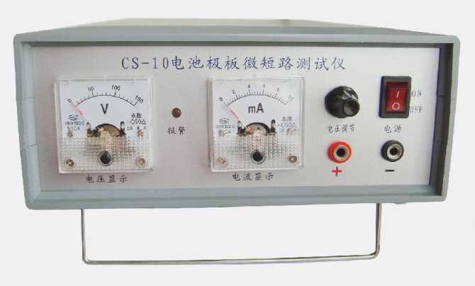 - CS-10極板短路測試儀是根據高壓擊穿的原理,對鋰電池的極板實施微短路測試的專用儀器,以漏電電流的大小來判斷其極板短路的程度,操作簡單,使用方便,在測試時,只需將兩測試表筆接上被測物,即可實時顯示被測物的漏電電流實際值,當漏電電流較大時儀器會給予報警提示,本儀器用于未注液的電池極板微短路測試。