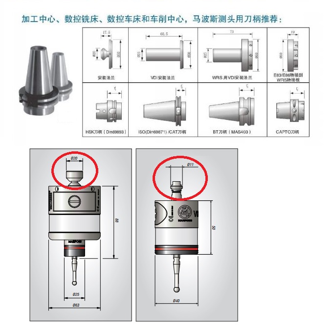 測頭刀柄與馬波斯探頭連接部分尺寸為訂制,根據測頭型號進行確認。